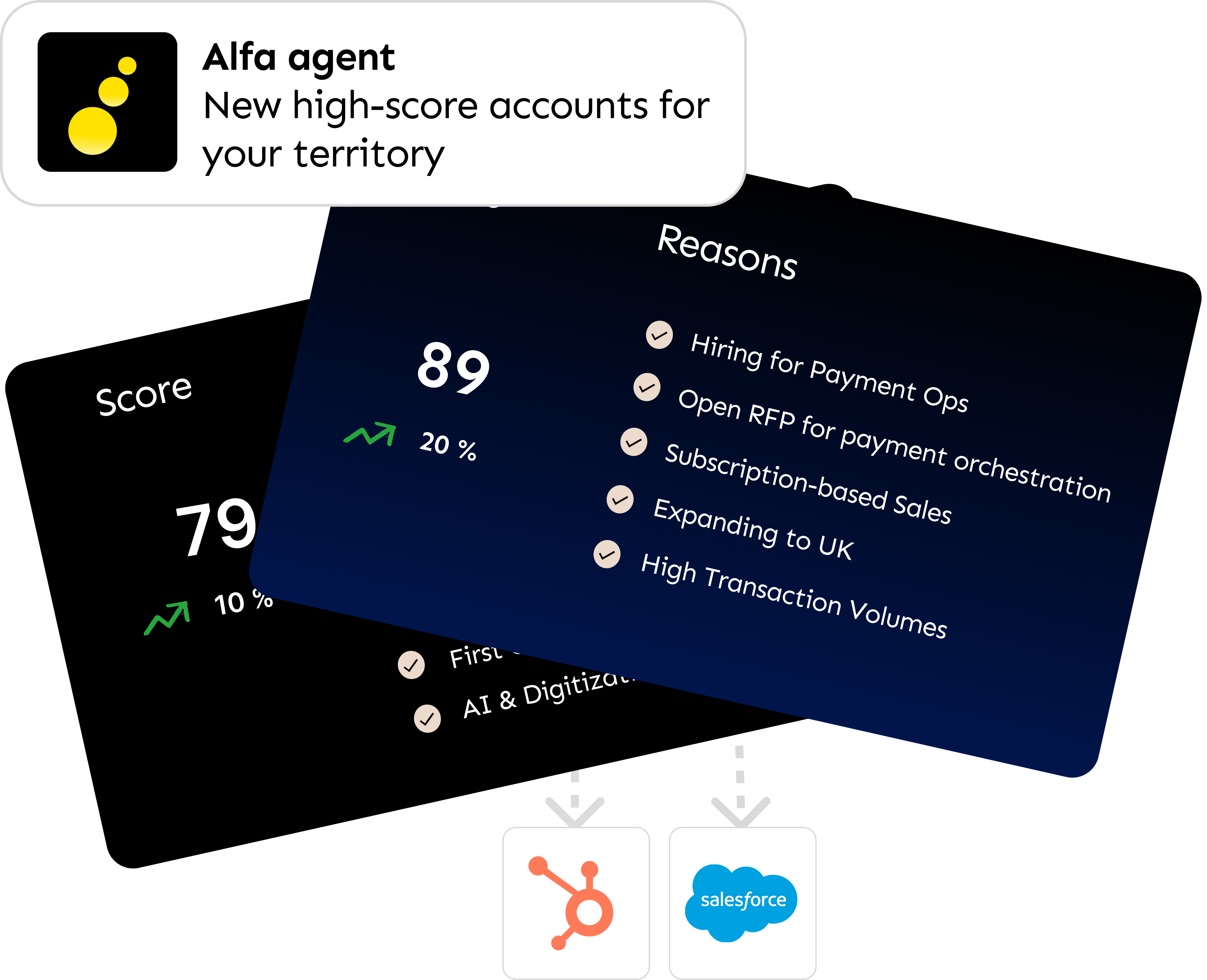 Stop buying lists and spreading your team thin. Alfa AI agents work 24/7 to create a feed of curated, winnable accounts for your reps.